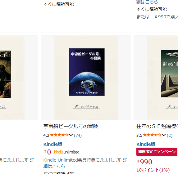 例えば「宇宙船ビーグル号 A.E.ヴァン ヴォクト著(1950年発表)」とかは、電子版を出しているのはグーデンベルク21だけである。