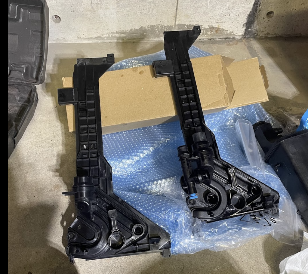 エクスパンションタンクをラジエータに固定する役割と、配管の役割を兼ねている。(中に空洞があって、冷却水が通るようになっている)全部細いホースで組み立てると大変だから、こうやって合理化しているんだろね。