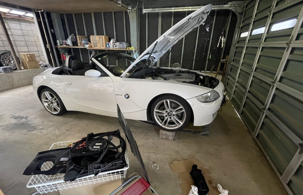 図を調べると確かに左前にエクスパンションタンクがあり、Z4のベースになっているE46の3シリーズでは、このタンク自体に亀裂が入ったり、タンクの固定と配管を兼ねているパーツとのつなぎ目から漏れたりするのが定番らしい。