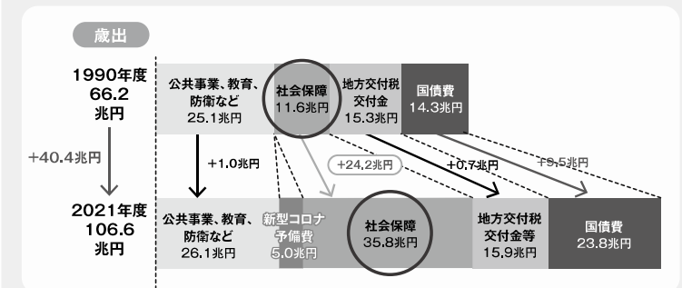 確かにこれには一理あって、1990年ごろには社会保障費って1/6だったわけ。1/3は公共事業や国防に使われていたから、この辺無駄遣いを何とかしないといって言う認識は正しかった。