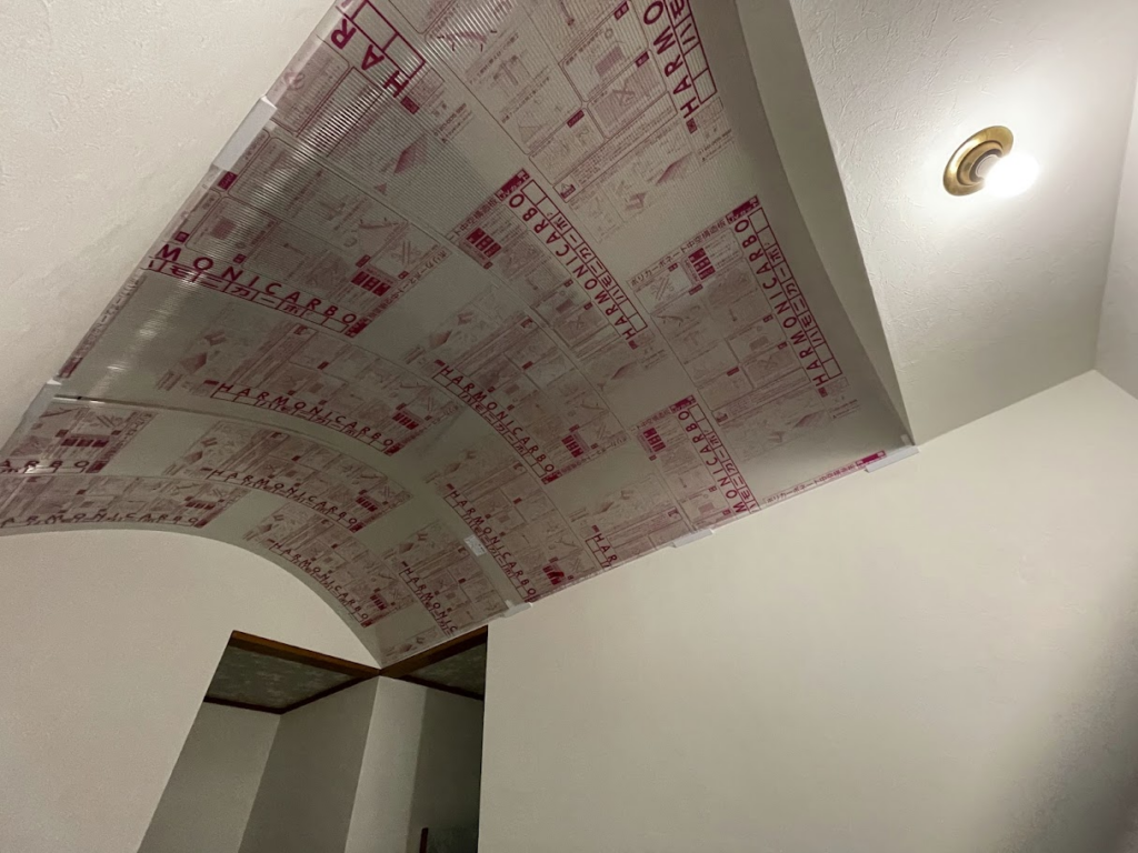 ハモニカーボは1820×910mmで売られていたので、これをカットしないと・・・いやまてよ。微妙にたわむから、このまま付けられないかな?と思って付けたのがコレ。