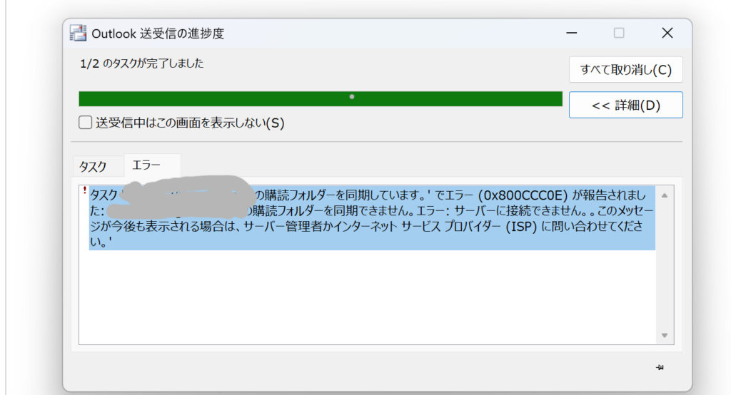 タスク***の購読フォルダーを同期しています。’でエラー(0x800CCC0E)が報告されました:***の購読フォルダーを同期できません。エラー:サーバーに接続できません。。このメッセージが今後も表示される場合は、サーバー管理者かインターネットサービスプロバイダー(ISP)に問い合わせてください。’
