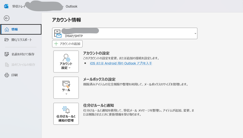 OutlookからGmailの紐づけを解除するにはOutlookの[ファイル]→[アカウント設定]→[アカウント設定]