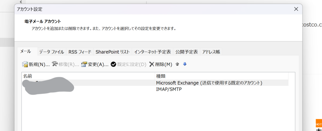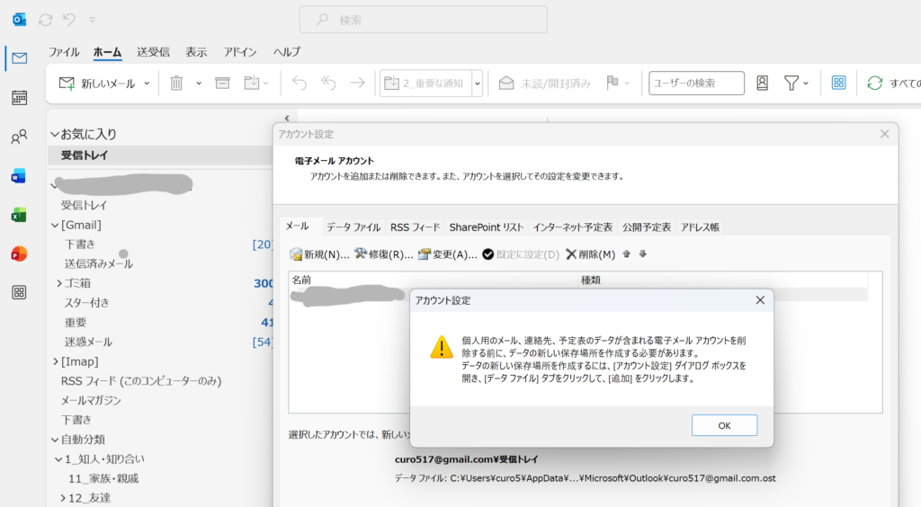 ・それをするためにはいったんOutlookからGmailの設定を削除する必要がある